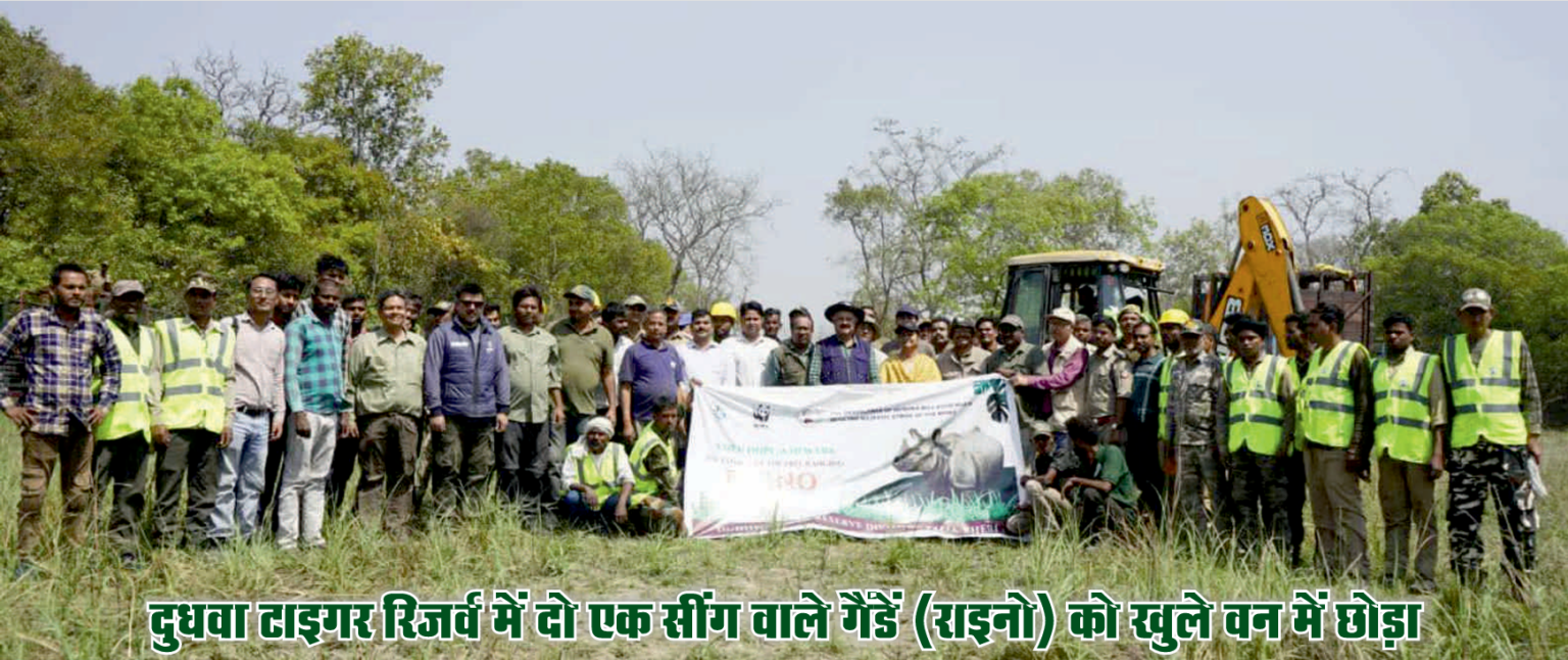 27 मार्च 2025, उत्तर प्रदेश वन विभाग के प्रधान मुख्य वन संरक्षक (HoFF) श्री सुनील चौधरी और प्रधान मुख्य वन संरक्षक (वन्यजीव) श्रीमती अनुराधा वेमुरी के कुशल निर्देशन में दुधवा टाइगर रिजर्व में दो और बड़े एक सींग वाले गैंडों को खुले स्थान पर छोड़ा है। भारत के तराई क्षेत्र में मुक्त रूप से घूमने वाले गैंडों को लाने और उनकी आबादी बढ़ाने के उद्देश्य से गैंडों को स्थानांतरित करने का अभियान 27 मार्च 2025 को सरकारी अधिकारियों, क्षेत्र कार्यकर्ताओं, नेपाल राष्ट्र, असम और उत्तर प्रदेश पशु चिकित्सकों, गैंडा विशेषज्ञों और महावतों के सहयोग से किया गया।