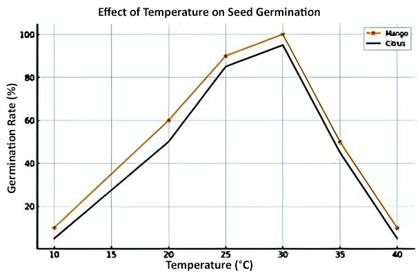Temperature: Temperature is a key factor in plant growth and development, influencing nearly every physiological process, from seed germination to flowering and fruiting. The optimal temperature range supports peak metabolic activity, including photosynthesis, respiration, and nutrient absorption. Effect of temperature on germination: Temperature affects seed sprouting and seedling growth. Most fruit crops germinate best between 20-30°C, optimizing metabolic processes for efficient sprouting and healthy growth.